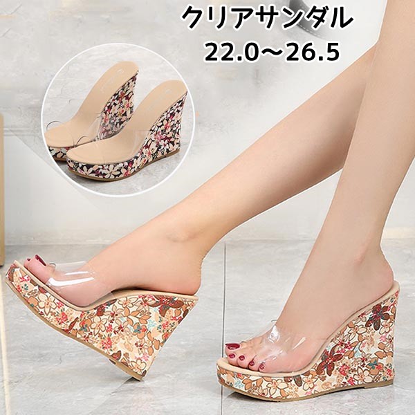 ウェッジソール サンダル 厚底 クリアサンダル オープントゥ 厚底サンダル 夏 疲れにくい 透明 ウェッジサンダル 大きいサイズ 花柄 カジュアル 通勤 リゾート ヒール11.5cm ベージュの通販は