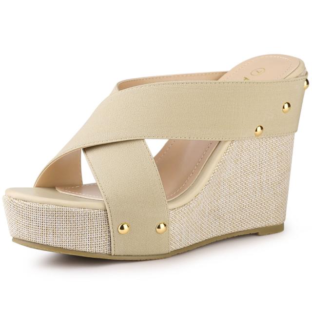 Allegra K サンダル レディース オープントゥ リネンプラットフォーム スライドウェッジヒール ベージュ 26.5 cmの通販は